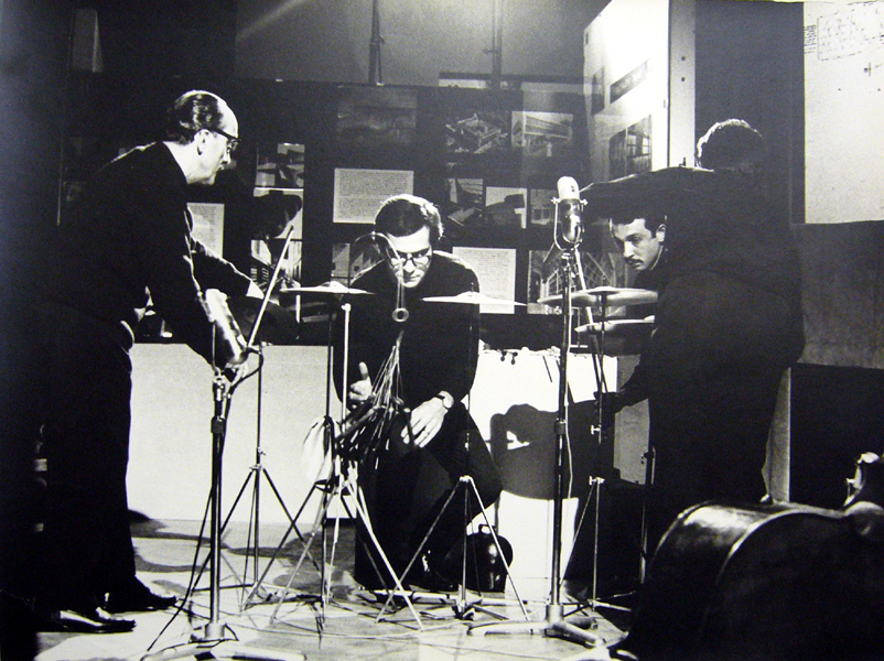 Mario Bertoncini: QUODLIBET (1964) Performers: Osvaldo Remedi, John Heineman, Walter Branchi, Luigi Lansillotta Photographer: Roberto Carnevali Resolution (full size): 802 x 600 |